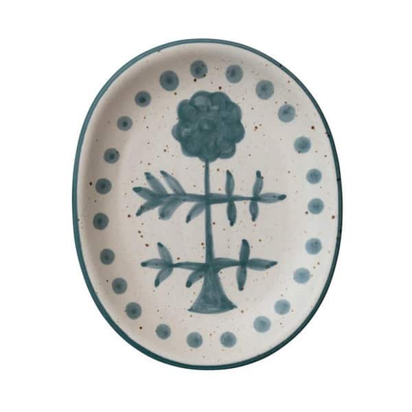 10 in. Navy Blue and Cream Oval Stoneware Hand Painted Platters with Floral Design