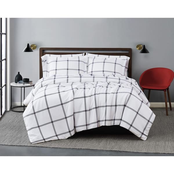 Printed Windowpane 3-Piece White/Charcoal Grey Microfiber Full/Queen Comforter Set