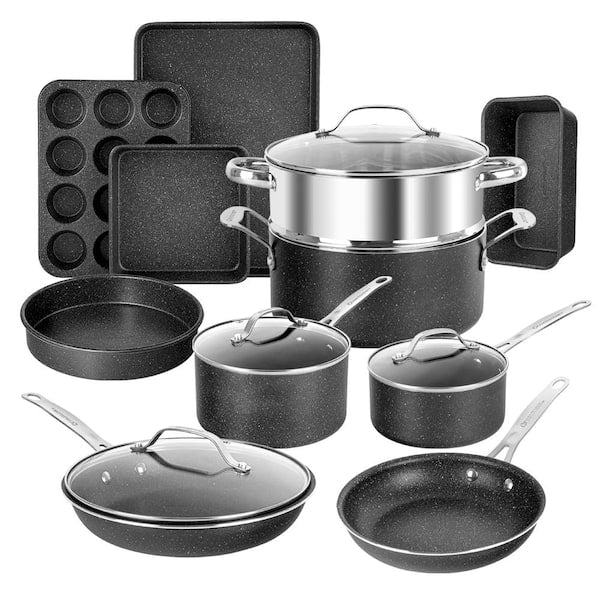15-Piece Aluminum Ultra-Durable Non-Stick Diamond Infused Cookware and Bakeware Set in Black