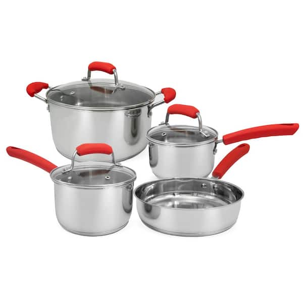 7-Piece Stainless Steel Cookware Set with Red Silicone handles